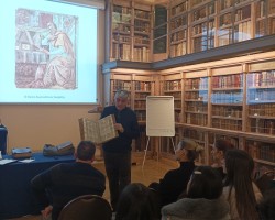 The students were given a tour of the Library and the the temporary exhibition “30 Years, 30 Books: Tiny, Mighty, Precious, Rare.” The tour, as well as the discussion around it, focused especially on the history of the book in Western Europe, the first Greek editions and religious editions during the Reformation. Afterwards, Professor Kaklamanis presented a lecture on the transition from oral to written literature and from the manuscript to the printed book, with special emphasis on early Modern Greek Literature.