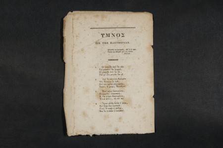 The first Greek edition of Hymn to Liberty by Dionysios Solomos, in Greek and Italian, printed in Mesolongi in 1825 during the siege.