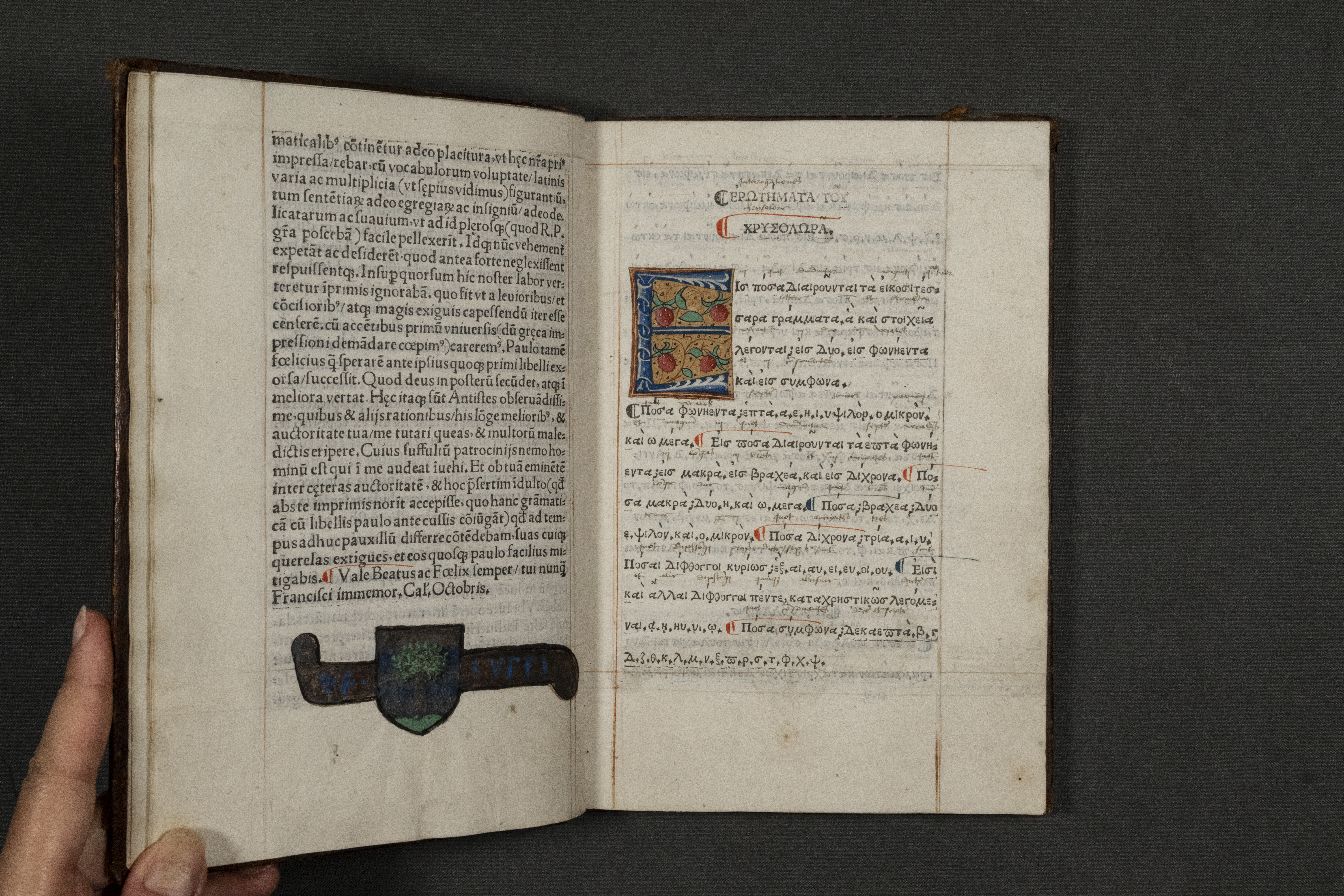 The most popular and influential Ancient Greek grammar of the Renaissance, by Manuel Chrysoloras, presented here in its first edition in France (Paris, 1507).