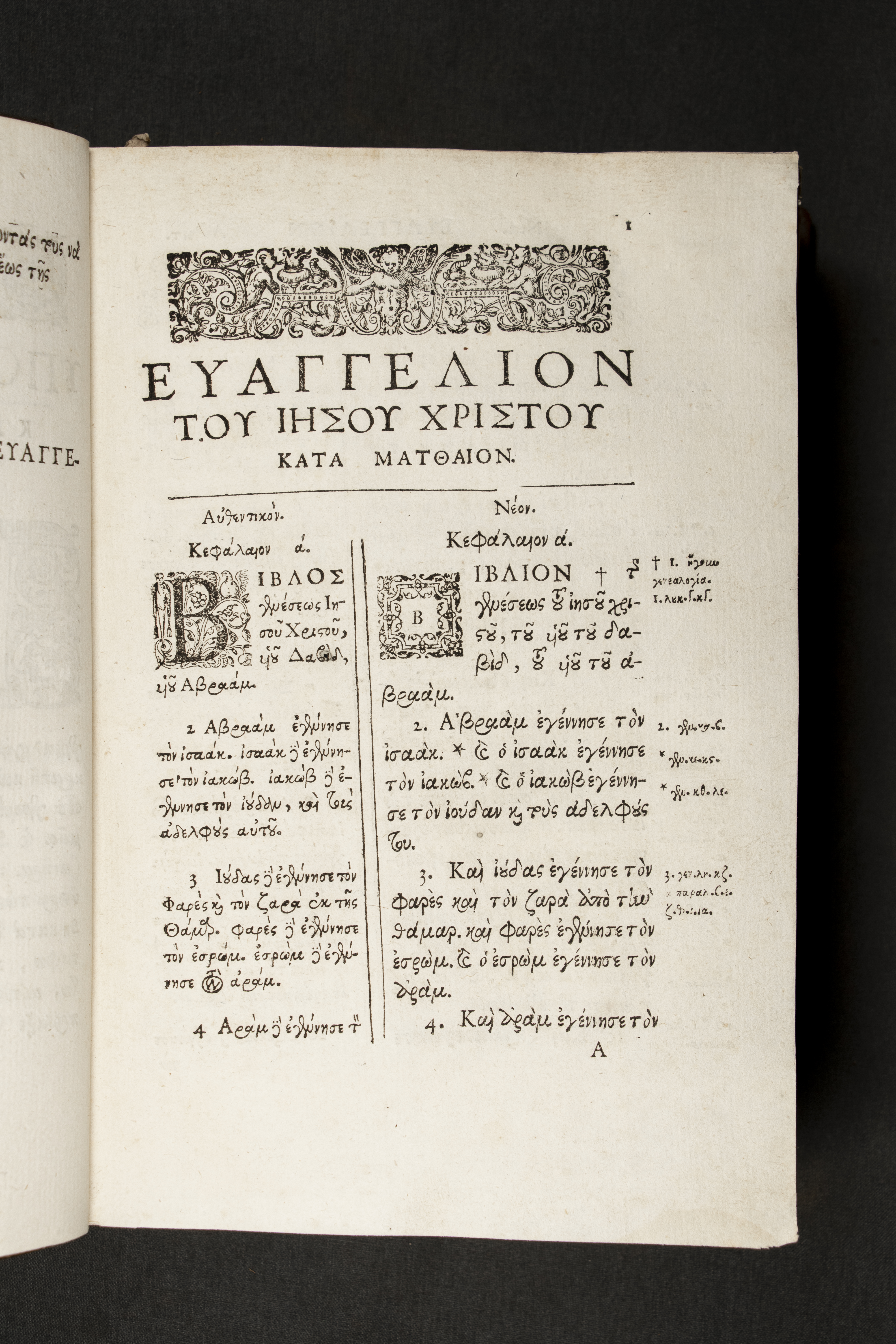 The first Modern Greek translation of the New Testament, by Maximos of Gallipoli, at the urging of Patriarch of Constantinople Kyrillos Loukaris (Geneva, 1638).