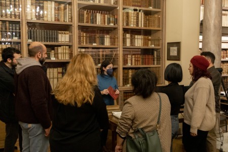 On Thursday, January 8 2026, o group of postgraduate students of philosophy from the University of Athens visited the Historical Library. The visit was organised by Constantin Irodotou, a member of the authorized teaching staff of the Department of Philosophy. The students were informed about the Foundation’s activities and services of the Historical Library, and were given a guided tour of the temporary exhibition “30 Years, 30 Books: Tiny, Mighty, Precious, Rare.” Particular emphasis was placed on the exhibits from the Enlightenment period, a point of focus of their course. The lecture was supported with an on-site presentation of books from the collections of the Historical Library. Among them were incunables and early printed books, volums from the monumental French Encyclopedia, edited by Diderot and d’Alembert, and works by prominent Greek enlightenment scholar Adamantios Korais in first editions.