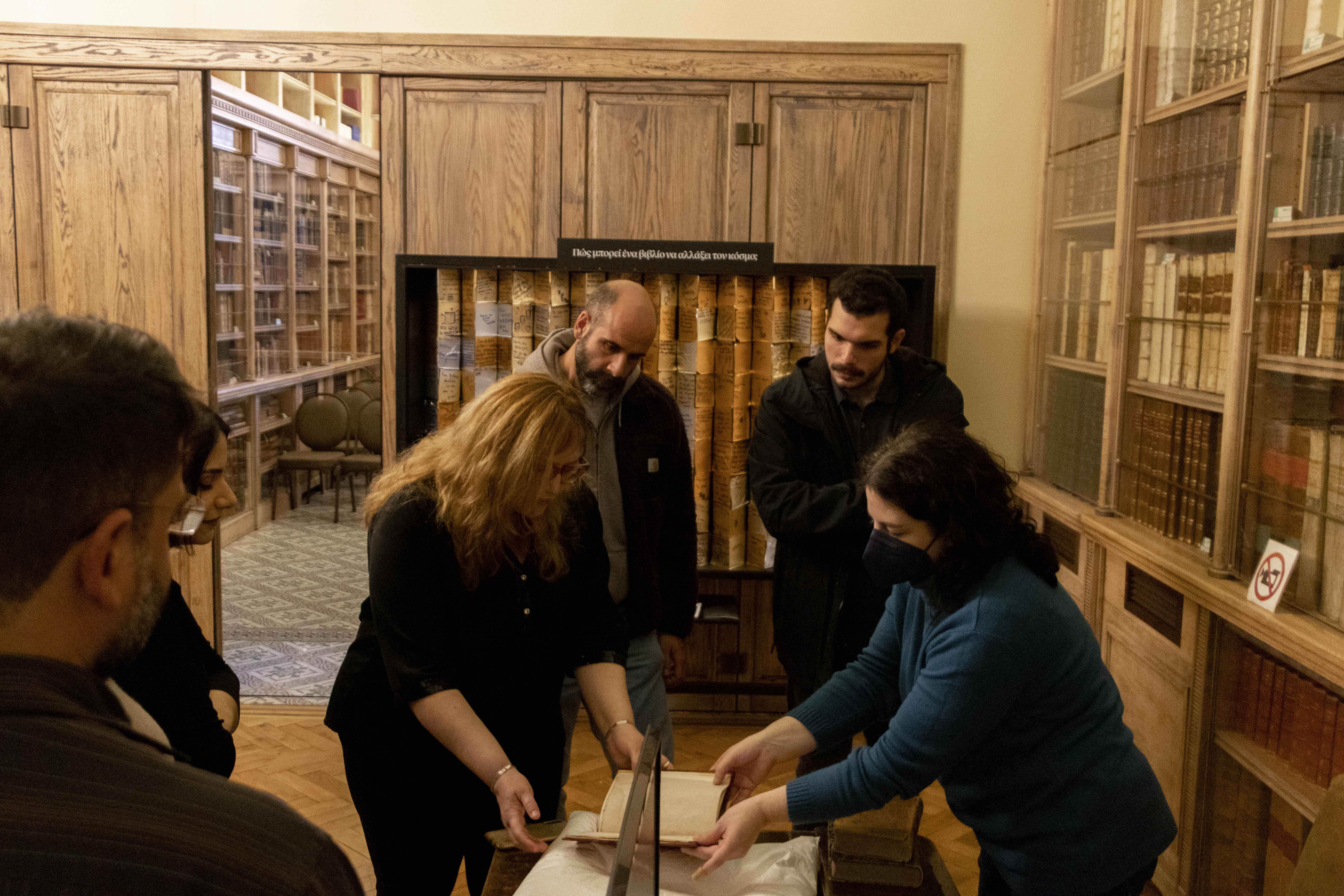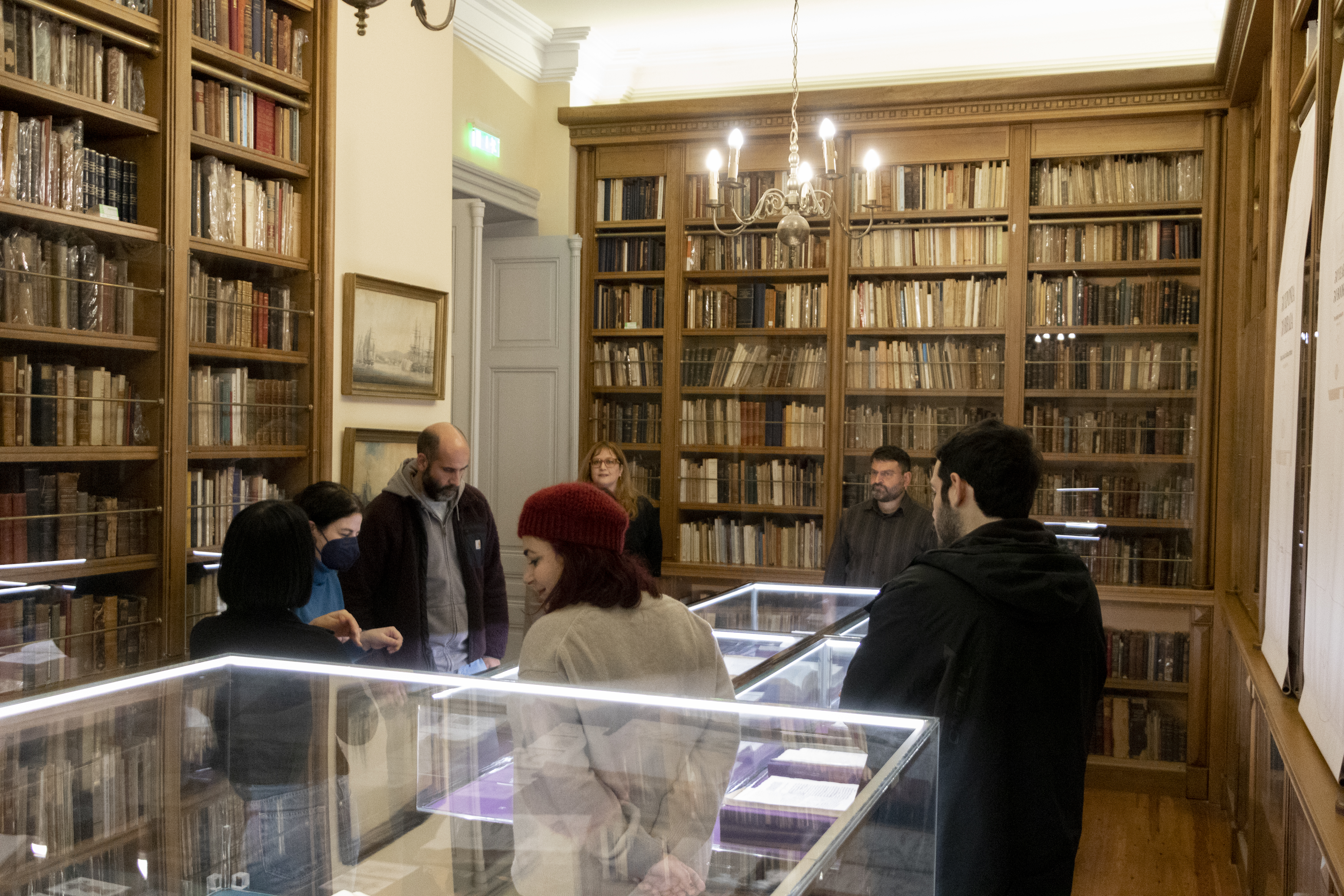 On Thursday, January 8 2026, o group of postgraduate students of philosophy from the University of Athens visited the Historical Library. The visit was organised by Constantin Irodotou, a member of the authorized teaching staff of the Department of Philosophy. The students were informed about the Foundation’s activities and services of the Historical Library, and were given a guided tour of the temporary exhibition “30 Years, 30 Books: Tiny, Mighty, Precious, Rare.” Particular emphasis was placed on the exhibits from the Enlightenment period, a point of focus of their course. The lecture was supported with an on-site presentation of books from the collections of the Historical Library. Among them were incunables and early printed books, volums from the monumental French Encyclopedia, edited by Diderot and d’Alembert, and works by prominent Greek enlightenment scholar Adamantios Korais in first editions.