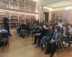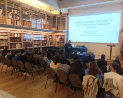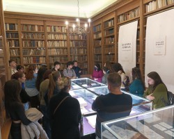 Οι φοιτητές ξεναγήθηκαν στην Ιστορική Βιβλιοθήκη και στην περιοδική έκθεση «30 χρόνια, 30 βιβλία: Μικρά, μεγάλα, πολύτιμα, σπάνια». Κατά τη διάρκεια της ξενάγησης και της σχετικής συζήτησης αναπτύχθηκαν μεταξύ άλλων θέματα όπως η ιστορία του βιβλίου στη δυτική Ευρώπη, οι πρώτες ελληνικές εκδόσεις και οι θρησκευτικές εκδόσεις κατά την περίοδο της Μεταρρύθμισης. Στη συνέχεια, ο κ. Κακλαμάνης πραγματοποίησε παρουσίαση με θέμα το πέρασμα από τον προφορικό στον γραπτό λόγο και από το χειρόγραφο στο έντυπο, με ιδιαίτερες αναφορές στην πρώιμη νεοελληνική λογοτεχνία.